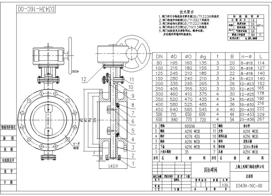 三、D343H 多層次硬密封蝶閥--主要連接及外形尺寸 公稱通徑 DN | 結(jié)構(gòu)長度L | 外形尺寸(參考值) | 連接(標(biāo)準(zhǔn)值) | 參考 重量Dt343H | | H | Dt343H | PN0.6MPa | PN1.0MPa | | mm | inch | 短 | 長 | H1 | A1 | B1 | D | D1 | z-d | D | D1 | z-d | | 50 | 2 | 108 | 150 | 112 | 350 | 180 | 200 | 140 | 110 | 4-14 | 165 | 125 | 4-18 | 17 | | 65 | 5/2 | 112 | 170 | 115 | 370 | 180 | 200 | 160 | 130 | 4-14 | 185 | 145 | 4-18 | 20 | | 80 | 3 | 114 | 180 | 120 | 380 | 180 | 200 | 190 | 150 | 4-18 | 200 | 160 | 8-18 | 23 | | 100 | 4 | 127 | 190 | 138 | 420 | 180 | 200 | 210 | 170 | 4-18 | 220 | 180 | 8-18 | 25 | | 125 | 5 | 140 | 200 | 164 | 460 | 180 | 200 | 240 | 200 | 8-18 | 250 | 210 | 8-18 | 40 | | 150 | 6 | 140 | 210 | 175 | 555 | 270 | 280 | 165 | 225 | 8-18 | 285 | 240 | 8-22 | 47 | | 200 | 8 | 152 | 230 | 208 | 605 | 270 | 280 | 320 | 280 | 8-18 | 340 | 295 | 8-22 | 60 | | 250 | 10 | 165 | 250 | 243 | 680 | 270 | 280 | 375 | 335 | 12-18 | 395 | 350 | 12-22 | 95 | | 300 | 12 | 178 | 270 | 283 | 800 | 380 | 420 | 440 | 395 | 12-22 | 445 | 400 | 12-22 | 124 | | 350 | 14 | 190 | 290 | 310 | 835 | 380 | 420 | 490 | 445 | 12-22 | 505 | 460 | 16-22 | 181 | | 400 | 16 | 216 | 310 | 340 | 915 | 450 | 470 | 540 | 495 | 16-22 | 565 | 515 | 16-26 | 260 | | 450 | 18 | 222 | 330 | 380 | 960 | 480 | 490 | 595 | 550 | 16-22 | 615 | 565 | 20-26 | 338 | | 500 | 20 | 229 | 350 | 410 | 1020 | 480 | 490 | 645 | 600 | 20-22 | 670 | 620 | 20-26 | 360 | | 600 | 24 | 267 | 390 | 470 | 1225 | 480 | 660 | 755 | 705 | 20-26 | 780 | 725 | 20-30 | 540 | | 700 | 28 | 292 | 430 | 550 | 1355 | 640 | 660 | 860 | 810 | 24-26 | 895 | 840 | 24-30 | 580 | | 800 | 32 | 318 | 470 | 640 | 1470 | 640 | 660 | 975 | 920 | 24-30 | 1015 | 950 | 24-33 | 845 | | 900 | 36 | 330 | 510 | 710 | 1545 | 750 | 860 | 1075 | 1020 | 24-30 | 1115 | 1050 | 28-33 | 1050 | | 1000 | 40 | 410 | 550 | 770 | 1795 | 850 | 860 | 1175 | 1120 | 28-30 | 1230 | 1160 | 28-36 | 1500 | | 1200 | 48 | 470 | 630 | 890 | 1965 | 850 | 900 | 1405 | 1340 | 32-33 | 1455 | 1380 | 32-39 | 2000 |