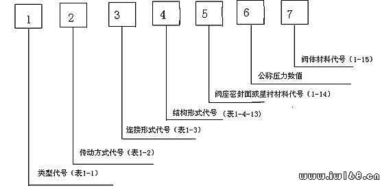 二、按用途,根據(jù)閥門的不同用途可分: 1. 開斷用:用來接通或切斷管路介質(zhì),如截止閥、閘閥、球閥、蝶閥等。 2. 止回用:用來防止介質(zhì)倒流,如止回閥。 3. 調(diào)節(jié)用:用來調(diào)節(jié)介質(zhì)的壓力和流量,如調(diào)節(jié)閥、減壓閥。 4. 分配用:用來改變介質(zhì)流向、分配介質(zhì),如三通旋塞、分配閥、滑閥等。 5. 安全閥:在介質(zhì)壓力超過規(guī)定值時,用來排放多余的介質(zhì),保證管路系統(tǒng)及設 備安全,如安全閥、事故閥。 6. 他特殊用途:如疏水閥、放空閥、排污閥等。 ![]() ![]() ![]() 三、按驅(qū)動方式,根據(jù)不同的驅(qū)動方式可分: 1. 手動:借助手輪、手柄、杠桿或鏈輪等,有人力驅(qū)動,傳動較大力矩時,裝有 蝸輪、齒輪等減速裝置。 2. 電動:借助電機或其他電氣裝置來驅(qū)動。 3. 液動:借助(水、油)來驅(qū)動。 4. 氣動;借助壓縮空氣來驅(qū)動。 四、按壓力,根據(jù)閥門的公稱壓力可分: 1. 真空閥:絕對壓力<0.1Mpa即760mm汞柱高的閥門,通常用mm汞柱或mm 水柱表示壓力。 2. 低壓閥:公稱壓力PN≤1.6Mpa的閥門(包括PN≤1.6MPa的鋼閥) 3. 中壓閥:公稱壓力PN2.5—6.4MPa的閥門。 4. 高壓閥:公稱壓力PN10.0—80.0MPa的閥門。 5. 超高壓閥:公稱壓力PN≥100.0MPa的閥門。 五、按介質(zhì)的溫度分,根據(jù)閥門工作時的介質(zhì)溫度可分: 1. 普通閥門:適用于介質(zhì)溫度-40℃~425℃的閥門。 2. 高溫閥門:適用于介質(zhì)溫度425℃~600℃的閥門。 3. 耐熱閥門:適用于介質(zhì)溫度600℃以上的閥門。 4. 低溫閥門:適用于介質(zhì)溫度-40℃~ -150℃的閥門。 5. 超低溫閥門:適用于介質(zhì)溫度-150℃以下的閥門。 六、按公稱通徑分,根據(jù)閥門的公稱通徑可分: 1. 小口徑閥門:公稱通徑DN<40mm的閥門。 2. 中口徑閥門:公稱通徑DN50~300mm的閥門。 3. 大口徑閥門:公稱通徑DN350~1200mm的閥門。 4. 特大口徑閥門:公稱通徑DN≥1400mm的閥門。 七、按與管道連接方式分,根據(jù)閥門與管道連接方式可分; 1. 法蘭連接閥門:閥體帶有法蘭,與管道采用法蘭連接的閥門。 2. 螺紋連接閥門:閥體帶有內(nèi)螺紋或外螺紋,與管道采用螺紋連接的閥門。 3. 焊接連接閥門:閥體帶有焊口,與管道采用焊接連接的閥門。 4. 夾箍連接閥門:閥體上帶有夾口,與管道采用夾箍連接的閥門。 5. 卡套連接閥門:采用卡套與管道連接的閥門。 第三節(jié) 閥門的型號編制方法 一、閥門的型號 閥門的型號是用來表示閥類、驅(qū)動及連接形式、密封圈材料和公稱壓力等要素的。 由于閥門種類繁雜,為了制造和使用方便,國家對閥門產(chǎn)品型號的編制方法做了統(tǒng)一規(guī)定。閥門產(chǎn)品的型號是由七個單元組成,用來表明閥門類別、驅(qū)動種類、連接和結(jié)構形式、密封面或襯里材料、公稱壓力及閥體材料。 閥門型號的組成由七個單元順序組成(見下表) ![]() 1.閥門的類型代號 表 1—1