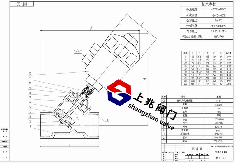產(chǎn)品介紹 螺紋氣動(dòng)角座閥--產(chǎn)品概述: 內(nèi)螺紋氣動(dòng)角座閥是由氣動(dòng)執(zhí)行器與角座閥組合而成,雙作用氣動(dòng)角座閥:當(dāng)氣源進(jìn)入執(zhí)行器的一端時(shí),閥桿帶動(dòng)活塞運(yùn)動(dòng)角座閥處于打開(kāi)狀態(tài);當(dāng)氣源從執(zhí)行器另一端進(jìn)入時(shí),閥桿帶動(dòng)活塞運(yùn)動(dòng)角座閥處于關(guān)閉狀態(tài)。單作用氣動(dòng)角座閥:角座閥常開(kāi),當(dāng)氣源進(jìn)入執(zhí)行器時(shí),拉伸彈簧帶動(dòng)閥桿向下運(yùn)動(dòng),閥門關(guān)閉;角座閥常閉:當(dāng)氣源進(jìn)入執(zhí)行器時(shí),壓縮彈簧帶動(dòng)閥桿向上運(yùn)動(dòng),閥門打開(kāi)。氣動(dòng)角座閥可代替進(jìn)口產(chǎn)品,品質(zhì)優(yōu)、貨期短,用戶們無(wú)需再等待漫長(zhǎng)的貨期了。 螺紋氣動(dòng)角座閥--工作原理: 在非工作狀態(tài)時(shí),由于彈簧力作用,閥門常閉(開(kāi))。當(dāng)執(zhí)行器活塞被壓縮氣體作用時(shí),閥門打開(kāi)(關(guān)閉)。雙作用形式靠壓縮氣體控制閥門開(kāi)關(guān)。 螺紋氣動(dòng)角座閥--應(yīng)用范圍: 啤酒飲料灌裝設(shè)備 制藥及醫(yī)療設(shè)備 印染紡織 化工行業(yè) 氣體工業(yè) 高溫滅菌 發(fā)泡機(jī)械 水/污水處理 螺紋氣動(dòng)角座閥--特點(diǎn): 流量大,流阻小,無(wú)水錘 Y型設(shè)計(jì),增加30%流量 超長(zhǎng)使用壽命 閥桿自動(dòng)校正,自潤(rùn)滑,免維護(hù) 氣缸采用不銹鋼材質(zhì),在惡劣環(huán)境中更加優(yōu)秀,可360°旋轉(zhuǎn)。 螺紋氣動(dòng)角座閥--技術(shù)參數(shù): 管道壓力:Max1.6Mpa(232psi) 控制壓力:0.3-0.8Mpa(43.5-116psi) 控制介質(zhì):中性氣體或空氣 閥體材料:CF8M/CF8(SS316,SS304) 密封材料:聚四氟乙烯 氣缸材料:塑料PPS 氣缸尺寸:27mm,32mm,40mm,50mm,63mm, 80mm,100mm,125mm 適用介質(zhì):水,酒精,油,染料,蒸汽,中性氣體或液體,有機(jī)溶劑,酸堿溶液 介質(zhì)溫度:-10℃-+180℃,25℃-+220℃ 環(huán)境溫度:-10℃-+80℃ 控制形式:?jiǎn)巫饔贸i],常開(kāi),雙作用常閉,雙作用自由態(tài) 連接形式:螺紋式,焊接式,法蘭式,快裝式 螺紋氣動(dòng)角座閥圖紙: ![]() 上兆閥門其他產(chǎn)品: 閘 閥 截止閥 球 閥 蝶 閥 緊急切斷閥 電磁閥 水力控制閥 止回閥 刀型閘閥 旋塞閥 過(guò)濾器 減壓閥 疏水閥 隔膜閥 調(diào)節(jié)閥 阻火器 呼吸閥 燃?xì)忾y門 冶金閥門 | ||