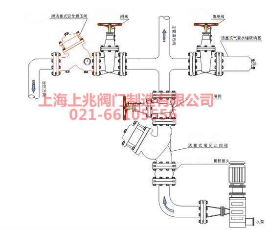 六、YQ98002型過濾活塞式安全泄壓閥--安裝方式及連接要求: 一、根據(jù)工況的減壓特性,必須在該閥前安裝 閘閥; 二、方便日后對該閥進(jìn)行檢修工作.必須在減壓閥后安裝可曲繞軟連接; 三‘最佳安裝方式為臥式,其它方位也可以接受; 四、必須留出足夠的工作空間方便檢修; 五、吊裝時采用有效措施進(jìn)行.也可利用該閥吊環(huán)進(jìn)行。 七、YQ98002型過濾活塞式安全泄壓閥--安裝圖: