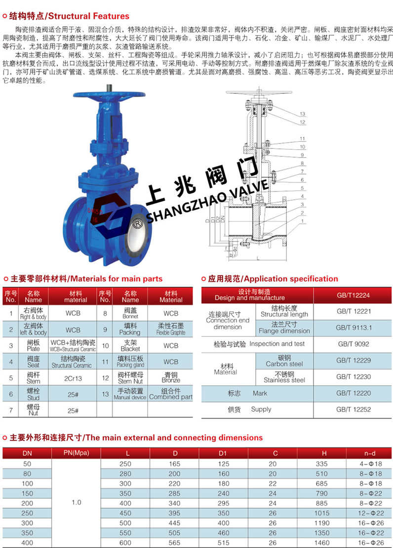 產(chǎn)品介紹 PZ41TC手動(dòng)陶瓷排渣閥--產(chǎn)品介紹: 1、 密封副采用高性能工程結(jié)構(gòu)陶瓷,閥門耐磨、耐腐蝕,長壽命。 2、 閥體底部及出口端鑲嵌結(jié)構(gòu)陶瓷大大提高了閥門的耐沖刷能力。 3、 閥體出口端導(dǎo)渣口的優(yōu)化設(shè)計(jì),實(shí)現(xiàn)閥體底部不積渣,閥門關(guān)閉嚴(yán)密。 4、 閥體內(nèi)腔可通過特殊處理實(shí)現(xiàn)防垢、防腐、防磨等特性。 PZ41TC手動(dòng)陶瓷排渣閥工況: PZ41TC 手動(dòng)陶瓷排渣閥--適用于磨損嚴(yán)重的渣漿管路,及固體顆粒較多和帶有較大顆粒的惡劣工況,如石化行業(yè)催化裂化系統(tǒng),電廠灰水管路。 PZ41TC手動(dòng)陶瓷排渣閥--技術(shù)規(guī)范: 1、 公稱壓力:1.0~6.4Mpa 2、 公稱通徑:DN50~600 3、 適用溫度:-40~900℃ 4、 連接形式:法蘭 5、 驅(qū)動(dòng)方式:手動(dòng)、電動(dòng)、電液聯(lián)動(dòng)、液動(dòng) PZ41TC手動(dòng)陶瓷排渣閥--特點(diǎn): 1、所有介質(zhì)接觸的部分均為結(jié)構(gòu)陶瓷材料,其化學(xué)穩(wěn)定性及硬度(洛氏硬度HRC90),僅次于金剛石。因此,本閥具有極高的耐磨損、耐腐蝕、耐沖蝕性能、且隔熱性好、熱膨脹小。 2、球體采用先進(jìn)研磨設(shè)備及工藝制造,球圓度精度高,表面質(zhì)量好,與閥座對研后,利用Zr02陶瓷的自滑潤性,可取得很好的密封性能。 3、陶瓷良好的耐磨性,讓本閥經(jīng)久耐用,可靠性及高,使用壽命長,是鈦合金閥和蒙乃爾閥的2-4倍。 4、用于高硬度的顆粒介質(zhì),或有軟顆粒但又有腐蝕的介質(zhì)中,本閥門具有無可比擬的 優(yōu)勢,也是目前 合適此類介質(zhì)的閥門。 ![]() | ||