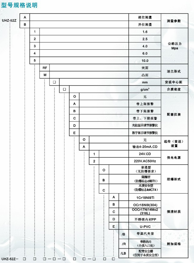 產(chǎn)品介紹 側(cè)裝式磁翻柱液位計(jì)--產(chǎn)品介紹: UH-52Z 側(cè)裝式磁翻柱液位計(jì),吸收國(guó)外同類產(chǎn)品、并加以吸收、消化、提高、按原化學(xué)工業(yè)部頒布的磁性液位計(jì)標(biāo)準(zhǔn)HG/T21584-95研制生產(chǎn)的產(chǎn)品。可用于塔、罐、槽、球形容器和鍋爐等設(shè)備的介質(zhì)液位檢測(cè)。該系列磁性液位計(jì)可以做到高密封、防泄漏適應(yīng)于高壓、高溫、腐蝕性介質(zhì)的液位測(cè)量,使用可靠,安全性好,它彌補(bǔ)了玻璃板(管)液位計(jì)指示不清晰,易破碎的不足,不受高、低溫度劇變的影響,不需多組液位計(jì)的組合。全過(guò)程測(cè)量無(wú)盲區(qū),顯示醒目,讀數(shù)直觀,測(cè)量范圍大,特別是現(xiàn)場(chǎng)指示部分,由于不與液體介質(zhì)直接接觸,所以對(duì)高溫、高壓高沾度、有毒、有害、強(qiáng)腐蝕性介質(zhì),更顯其優(yōu)越性。因此,它比傳統(tǒng)的玻璃管,板式液位計(jì)具有更高的可靠性、安全性、先時(shí)性、實(shí)用性。 側(cè)裝式磁翻液位計(jì)的最顯著特點(diǎn)是液體介質(zhì)與指示器完全隔離,所以在任何情況下都非常安全、可靠、耐用、而且各種型號(hào)的液位計(jì)配上液位報(bào)警、控制開關(guān),可實(shí)現(xiàn)液位或界位的上、下限越位報(bào)警、控制或聯(lián)鎖,配上靜壓式液位變送器或干簧-電阻式液位變送器,可將液位、界位信號(hào)轉(zhuǎn)換成二線制4-20mADC標(biāo)準(zhǔn)信號(hào),實(shí)現(xiàn)遠(yuǎn)距離指示、檢測(cè)、記錄與控制。該系列側(cè)裝式磁翻柱液位計(jì)可廣泛適用于電力、石油、化工、冶金、環(huán)保、船舶,建筑、食品等各行業(yè)生產(chǎn)過(guò)程中的液位測(cè)量與控制。 側(cè)裝式磁翻柱液位計(jì)--產(chǎn)品特點(diǎn): l 適合容器內(nèi)液體介質(zhì)的液位、界位的測(cè)量。除現(xiàn)場(chǎng)指示外,,還可配遠(yuǎn)傳變送器、報(bào)警開關(guān)、控制開 關(guān),檢測(cè)功能齊全。 l 指示新穎,讀數(shù)直觀、醒目、觀察指示器的方向可根據(jù)用戶需要改變角度。 l 測(cè)量范圍大,不受貯槽高度限制。 l 指示機(jī)構(gòu)與被測(cè)介質(zhì)完全隔離,因而密封性好,可靠性高,使用安全。 l 結(jié)構(gòu)簡(jiǎn)單,安裝方便,維護(hù)費(fèi)用低。 l 耐腐蝕、無(wú)需電源、防爆 UH-52Z側(cè)裝式磁翻柱液位計(jì)結(jié)構(gòu)原理: 液位計(jì)根據(jù)浮力原理和磁性耦合作用研制而成。當(dāng)被測(cè)容器中的液位升降時(shí),液位計(jì)主導(dǎo)管中的浮子流量計(jì)也隨之升降,浮子內(nèi)的永久磁鋼通過(guò)磁耦合傳遞到現(xiàn)場(chǎng)指示器,驅(qū)動(dòng)紅、白翻柱翻轉(zhuǎn)180°,當(dāng)液們上升時(shí),翻柱由白色轉(zhuǎn)為紅色,當(dāng)液位下降時(shí),翻柱由紅色轉(zhuǎn)為白色,指示器的紅、白界們焉得虎子為容器內(nèi)介質(zhì)液位的實(shí)際高度,從而實(shí)現(xiàn)液位的指示。 液體介質(zhì)密度與沉筒距對(duì)照表 (PN1 .6-40.MPa):